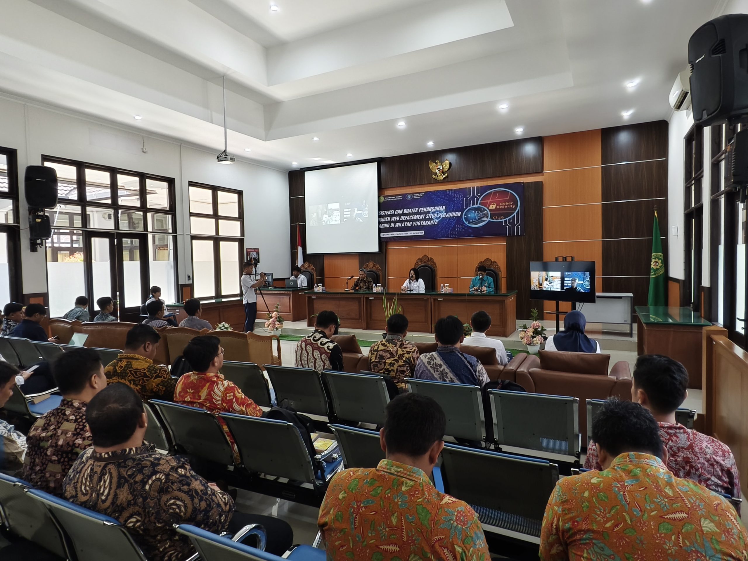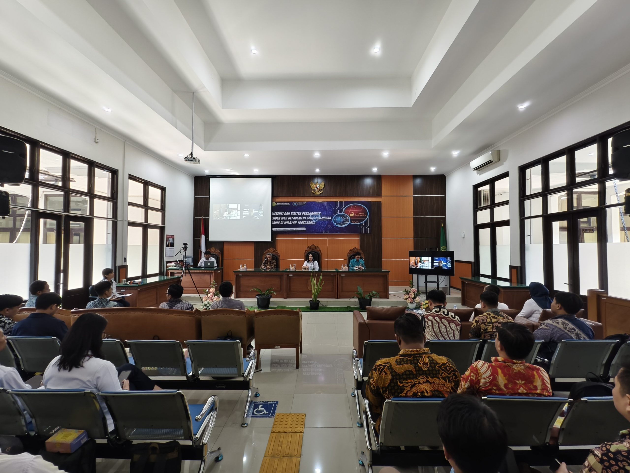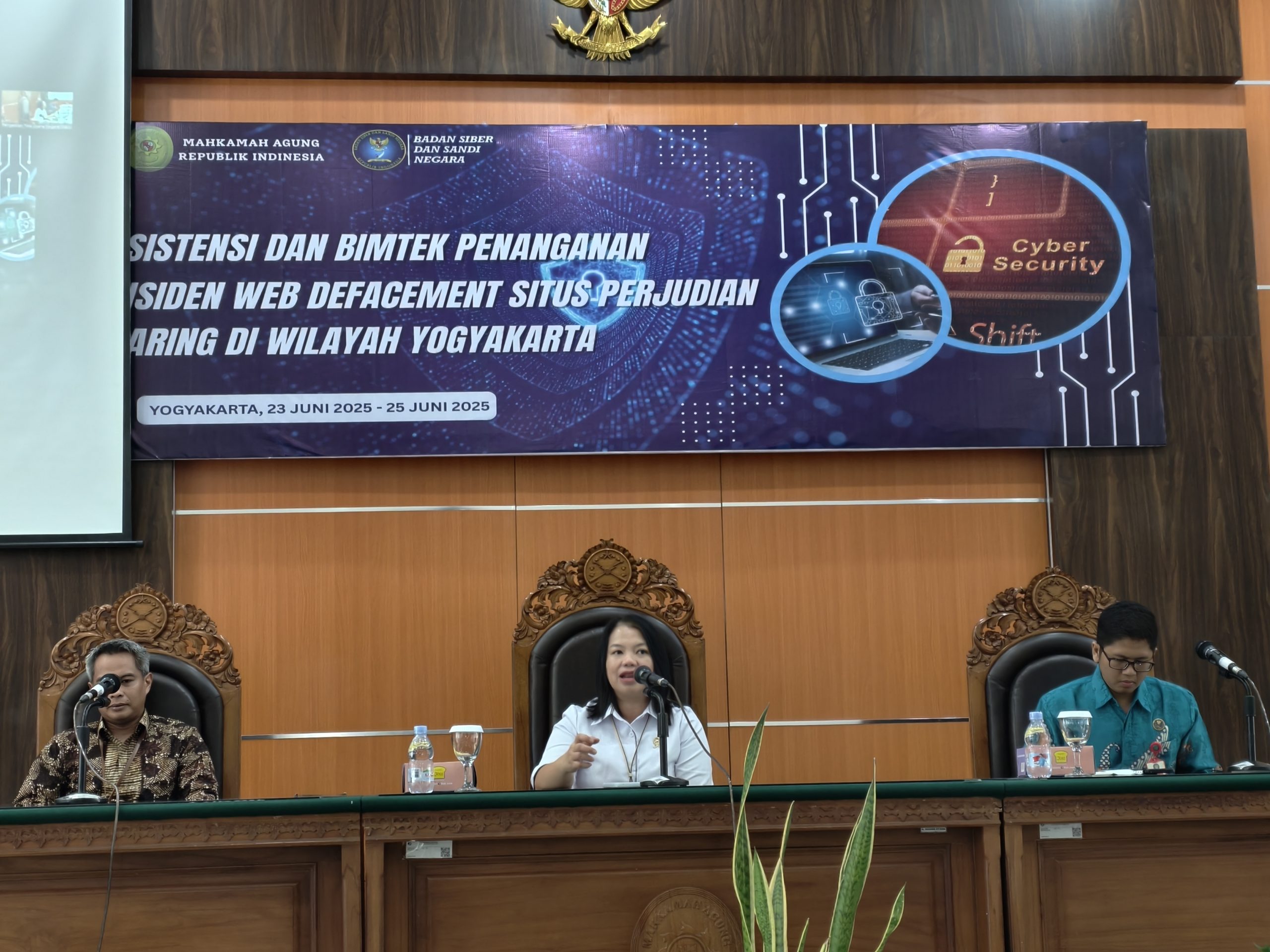 Yogyakarta, 23–26 Juni 2025 – Dalam upaya meningkatkan kesiapsiagaan satuan kerja peradilan terhadap ancaman keamanan siber, khususnya insiden web defacement yang dimanfaatkan untuk perjudian daring ilegal, Kegiatan ini diselenggarakan atas kerja sama antara Mahkamah Agung Republik Indonesia dengan Badan Siber dan Sandi Negara (BSSN), dan berlangsung selama empat hari, mulai tanggal 23 hingga 26 Juni 2025. Peserta kegiatan meliputi perwakilan dari satuan kerja peradilan di wilayah Daerah Istimewa Yogyakarta, termasuk PTUN Yogyakarta dan Pengadilan Militer Yogyakarta.