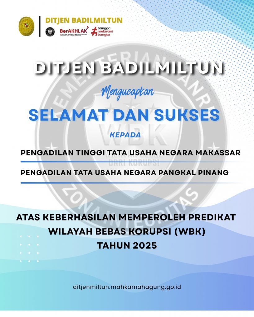 Jakarta, 8 September 2025 Direktur Jenderal Badan Peradilan Militer dan Peradilan Tata Usaha Negara Mahkamah Agung Marsekal Muda TNI Dr. Yuwono Agung Nugroho, S.H., M.H., melantik dan mengambil sumpah jabatan Pegawai Pemerintah Dengan Perjanjian Kerja di lingkungan Direktorat Jenderal Badan …