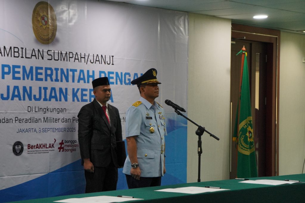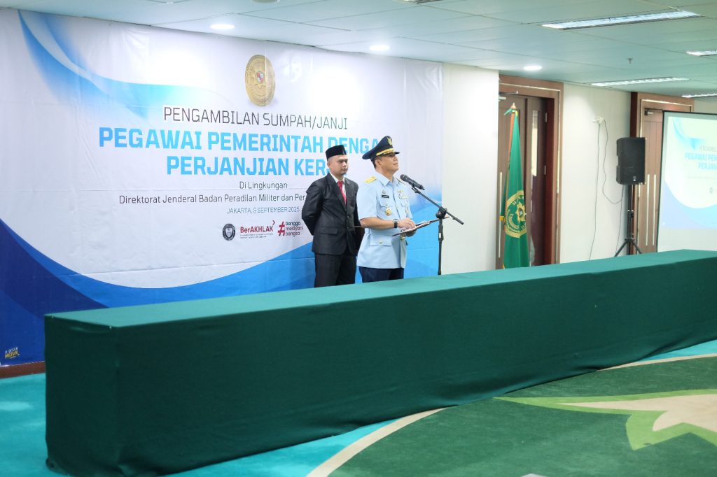 Jakarta, 8 September 2025 Direktur Jenderal Badan Peradilan Militer dan Peradilan Tata Usaha Negara Mahkamah Agung Marsekal Muda TNI Dr. Yuwono Agung Nugroho, S.H., M.H., melantik dan mengambil sumpah jabatan Pegawai Pemerintah Dengan Perjanjian Kerja di lingkungan Direktorat Jenderal Badan Peradilan Militer dan Tata Usaha Negara. Sebanyak 17 Pegawai Pemerintah Dengan Perjanjian Kerja dilantik di Gedung Sekretariat Mahkamah Agung RI.